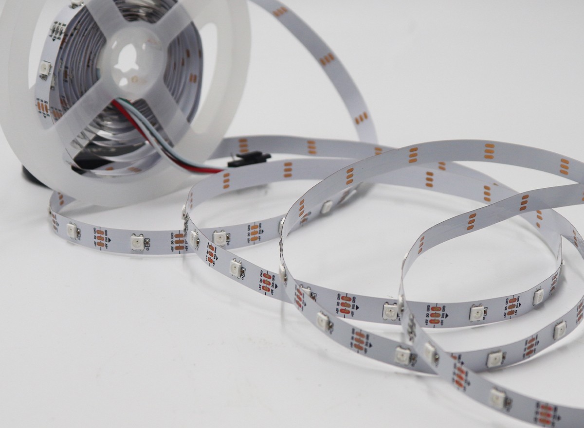 1、控制原理:一個IC控制1顆LED組成一個回路(一組),控制器通過控制IC對FPCB里面的電路進行控制,從而控制LED燈條變化不同的效果;如閃爍,追逐,跳變,順時針跑馬,逆時針跑馬,單色跑馬,變色跑馬,單顆追逐從頭到尾,流水,模擬閃電等;也可以根據客戶需要,自行編寫,編寫出所有想要的效果。